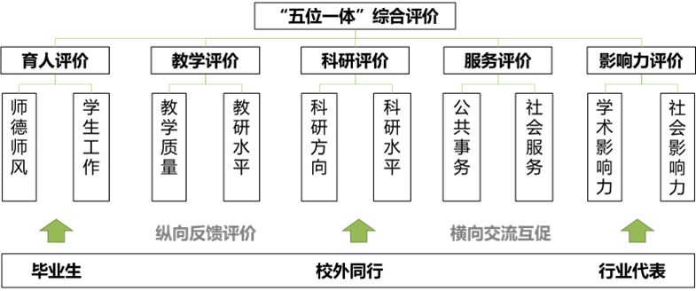 一是破除“五唯”,構(gòu)建多元主體的人才評(píng)價(jià)體系。評(píng)價(jià)主體多元化、評(píng)價(jià)客體多元化是高校教師評(píng)價(jià)的兩個(gè)基本特征,這也決定了評(píng)價(jià)標(biāo)準(zhǔn)必須是多元化、綜合性的。因此,教師單一評(píng)價(jià)主體應(yīng)向多主體轉(zhuǎn)變,學(xué)生成才、學(xué)科發(fā)展、經(jīng)濟(jì)發(fā)展、社會(huì)影響等應(yīng)成為評(píng)價(jià)人才隊(duì)伍建設(shè)水平和教師個(gè)人能力的主要維度,問(wèn)題解決、技術(shù)轉(zhuǎn)化、“三農(nóng)”發(fā)展、政策影響等應(yīng)成為主要評(píng)價(jià)指標(biāo)。在“五唯”評(píng)價(jià)中主體單一、以校內(nèi)評(píng)價(jià)為主,導(dǎo)致論文、帽子越多,但人才隊(duì)伍解決實(shí)際問(wèn)題的能力較弱,“卡脖子”問(wèn)題越來(lái)越多。浙江農(nóng)林大學(xué)在專(zhuān)業(yè)技術(shù)職務(wù)評(píng)聘辦法中,探索建立一套“五位一體”教師多元化綜合評(píng)價(jià)體系,包括育人評(píng)價(jià)、教學(xué)評(píng)價(jià)、科研評(píng)價(jià)、服務(wù)評(píng)價(jià)和影響力評(píng)價(jià)五個(gè)維度(圖2),評(píng)價(jià)主 體外延至畢業(yè)生、校外同行和行業(yè)代表。