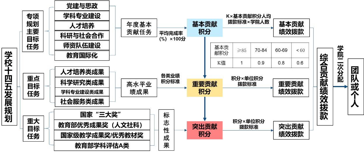 二是建立積分模型,引導(dǎo)學(xué)院實(shí)施“雙輪戰(zhàn)略”。在體制機(jī)制、用房編制等辦學(xué)要素一定的前提下,學(xué)院辦學(xué)經(jīng)費(fèi)是學(xué)院建設(shè)發(fā)展的最重要資源,同時(shí)也是最容易調(diào)節(jié)的變量。學(xué)校應(yīng)將整體發(fā)展目標(biāo)指標(biāo)和任務(wù)要求進(jìn)行梳理分解,根據(jù)不同階段的發(fā)展規(guī)劃和發(fā)展重點(diǎn),賦予不同權(quán)重,形成辦學(xué)經(jīng)費(fèi)分配模型,最高效率發(fā)揮辦學(xué)經(jīng)費(fèi)的杠桿作用,激發(fā)學(xué)院辦學(xué)動(dòng)力,引導(dǎo)學(xué)院用力方向。浙江農(nóng)林大學(xué)根據(jù)“十四五”規(guī)劃,通過(guò)對(duì)學(xué)校發(fā)展目標(biāo)、任務(wù)要求的梳理,突出“雙輪發(fā)展”戰(zhàn)略,強(qiáng)化了一流學(xué)科建設(shè)指標(biāo)和鄉(xiāng)村振興服務(wù)能力,賦予基礎(chǔ)貢獻(xiàn)、重要貢獻(xiàn)和突出貢獻(xiàn)不同權(quán)重,建立了綜合貢獻(xiàn)積分模型(圖1),用于學(xué)院辦學(xué)經(jīng)費(fèi)的分配,充分激發(fā)學(xué)院“雙輪發(fā)展”的動(dòng)力,有效調(diào)動(dòng)教師隊(duì)伍強(qiáng)農(nóng)興農(nóng)的激情和投入。