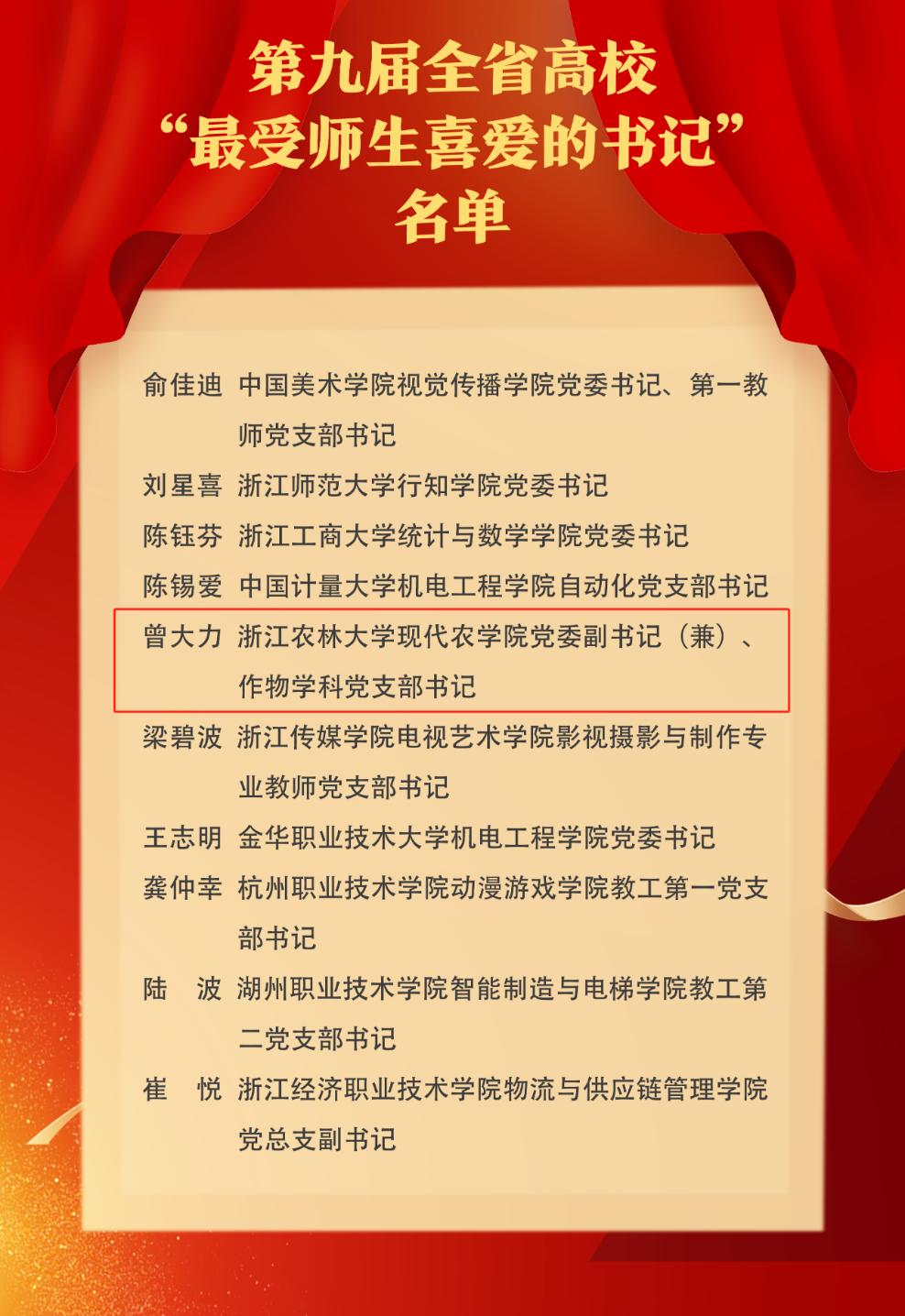 日前,浙江省普通高校黨建研究專業委員會、浙江教育宣傳中心公布了第九屆全省高校“最受師生喜愛的書記”名單。我校現代農學院院長、作物學科黨支部書記曾大力同志榮獲“最受師生喜愛的書記”稱號。