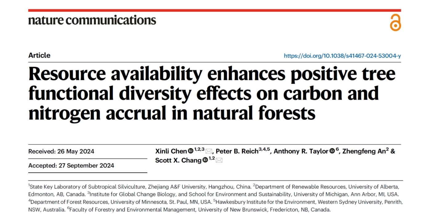 10月4日,國重實驗室陳信力教授團隊在《Nature》子刊《Nature Communications》(中科院1區Top,IF-5yr=16.1)在線發表題為《資源豐富度進一步增強了樹木功能多樣性對自然森林中碳氮積累的促進作用》(Resource availability enhances positive tree functional diversity effects on carbon and nitrogen accrual in natural forests)的研究論文,揭示了樹木功能多樣性對森林生態系統碳、氮累積的提升作用在資源豐富的環境下更強的科學結論。