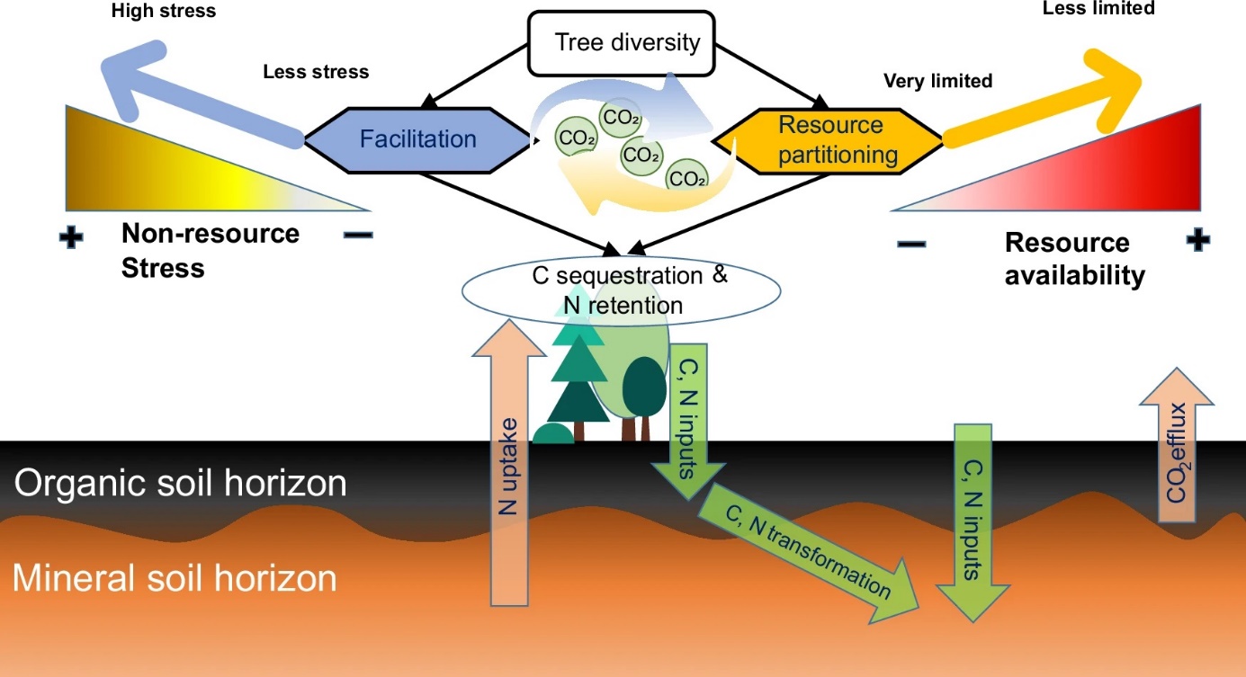 森林不僅是全球生物多樣性的核心載體,也是強大的碳氮匯。在大量控制實驗中,樹種多樣性的提升被證明可以通過增加樹木生物量和土壤中的碳固存來緩解氣候變化。然而,在自然森林中,不同環境梯度,特別是資源豐富度的變化,如何影響樹種多樣性對碳氮積累的作用,仍然缺乏深入理解。
