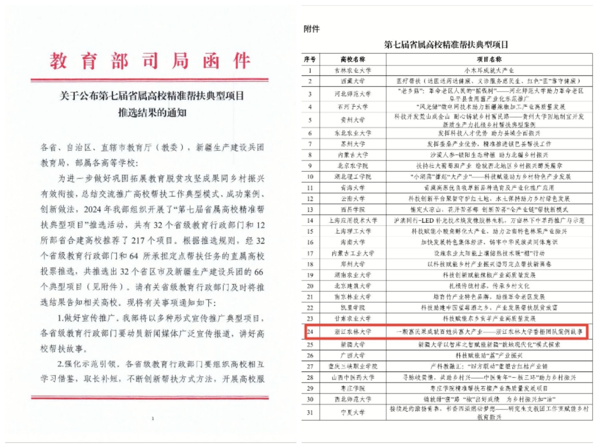 近日,教育部公布第七屆省屬高校精準(zhǔn)幫扶典型項(xiàng)目推選結(jié)果,我校報(bào)送的《一顆富民果成就百姓共富大產(chǎn)業(yè)——浙江農(nóng)林大學(xué)香榧團(tuán)隊(duì)案例故事》項(xiàng)目成功入選,這是教育部開(kāi)展項(xiàng)目推選以來(lái),學(xué)校第二次獲此成果。