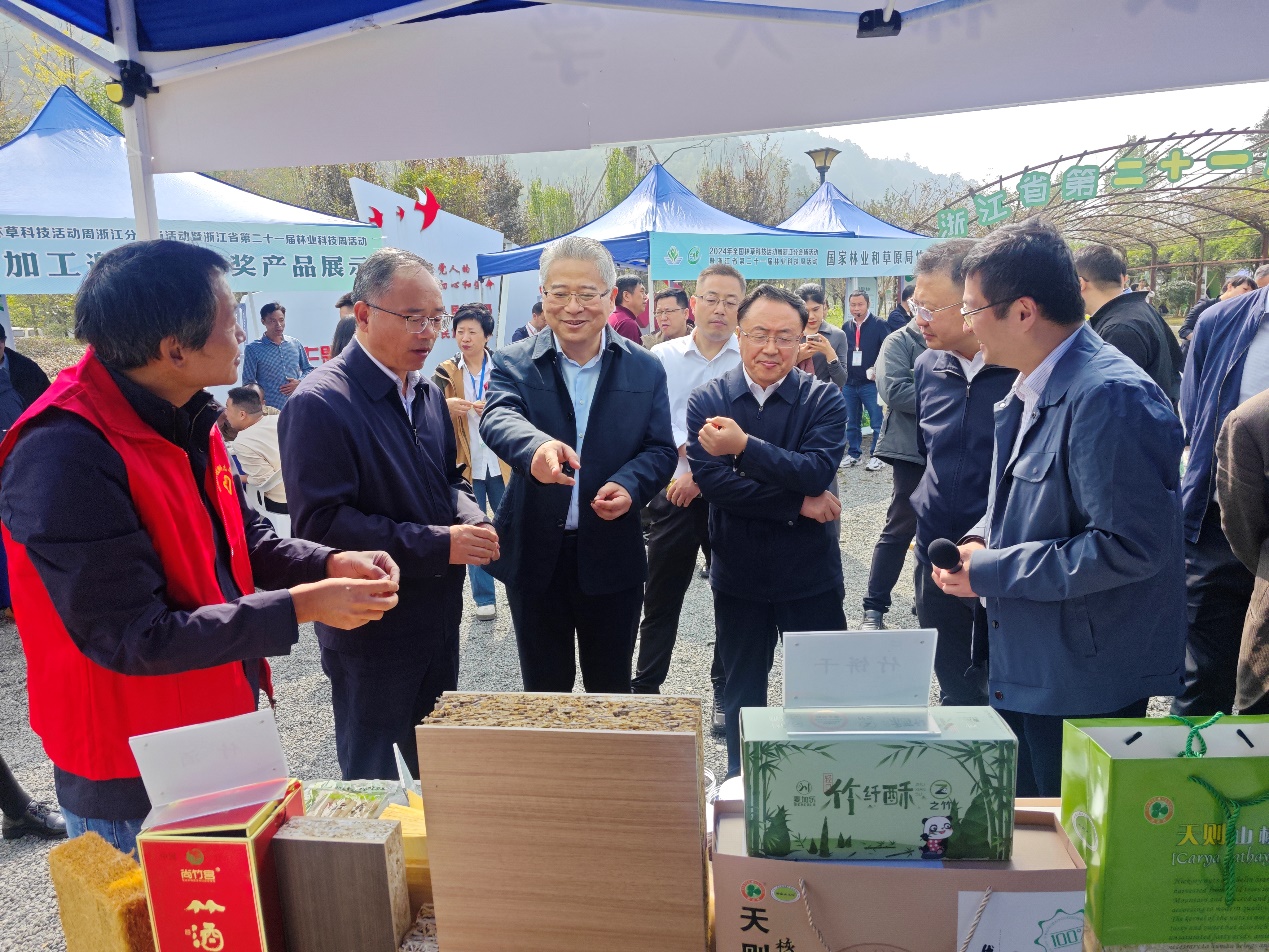 活動期間,我校組織了香榧炒制加工技藝展示、木本糧油成果展示及咨詢服務等活動,并在成果展區展示了我校亞熱帶森林培育國家重點實驗室、國家林業和草原局竹林碳匯工程技術研究中心、國家林業局香榧工程技術研究中心、國家林業局鐵皮石斛工程技術研究中心、黃精產業國家創新聯盟等創新平臺的多項成果,包括開口香榧、山核桃、秸稈板、竹原纖維、竹材薄刨切文創產品、黃精、金線蓮、三葉青等多款特色產品。省林業局黨組書記、局長胡俠,省林業局副局長諸葛承志、中國林科院副院長王軍輝等領導參觀了我校相關科技產品成果。