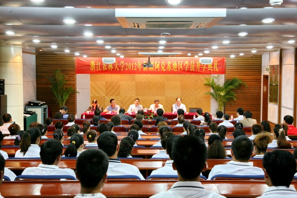浙農(nóng)林大新聞網(wǎng)訊  4月27日上午,我校2012年新疆阿克蘇地區(qū)學(xué)員開學(xué)典禮在活動中心舉行。校黨委副書記余杰、副校長王自勇,新疆阿克蘇地區(qū)普通高校畢業(yè)生赴浙江省培養(yǎng)工作副總領(lǐng)隊王星、赴我校領(lǐng)隊張平出席開學(xué)典禮。學(xué)校相關(guān)職能部門和學(xué)院(部)負責(zé)人,新疆阿克蘇地區(qū)來校學(xué)習(xí)的學(xué)員、帶隊輔導(dǎo)員等百余人參加了典禮。典禮由學(xué)工部部長張敏生主持。