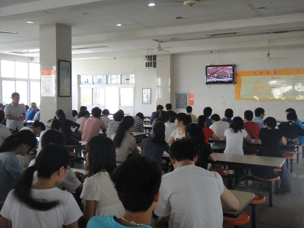 下午3:30,大會正式開始。衣錦食堂現場一片肅穆,在場全體團員青年跟著音響的旋律合唱中華人民共和國國歌,認真聆聽胡錦濤總書記在大會上的重要講話,共同回憶中國共產主義青年團成立90周年以來的奮斗歷程以及93年前那場轟轟烈烈的青年運動。