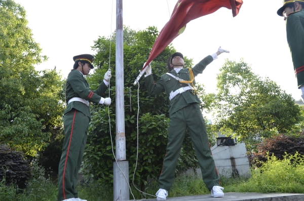 伴隨著國旗班旗手嘹亮的口號聲,升國旗儀式正式開始。身穿綠色軍裝的國旗班方陣踏著整齊的步伐走向升旗臺,鏗鏘有力的腳步聲震撼著在場的每一位同學。隨后,護旗手將國旗交給升旗手,一系列的程序有條不紊地進行著。“升國旗,奏國歌。”在雄壯的國歌聲中,鮮艷的五星紅旗徐徐升起。