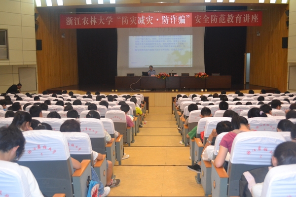 浙農林大新聞網訊  5月9日晚上,在圖書館第一報告廳舉行了“防災減災·防詐騙”安全防范教育講座。保衛處長馬小輝主持并講話,講座由錦城派出所中隊指導員呂清良主講,各學院輔導員、保衛處綜合科、治安科負責人及600余名學生參加了講座。