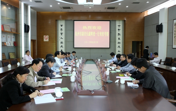 5月3日上午,杭州市副市長戚哮虎率市政府副秘書長趙國欽、市農辦、市林水局等相關部門負責人,在臨安市政府有關部門負責人的陪同下來校考察。校長周國模、副校長鮑濱福等接待了客人,并與客人們進行了座談。