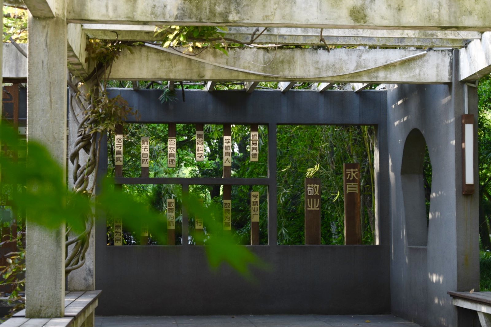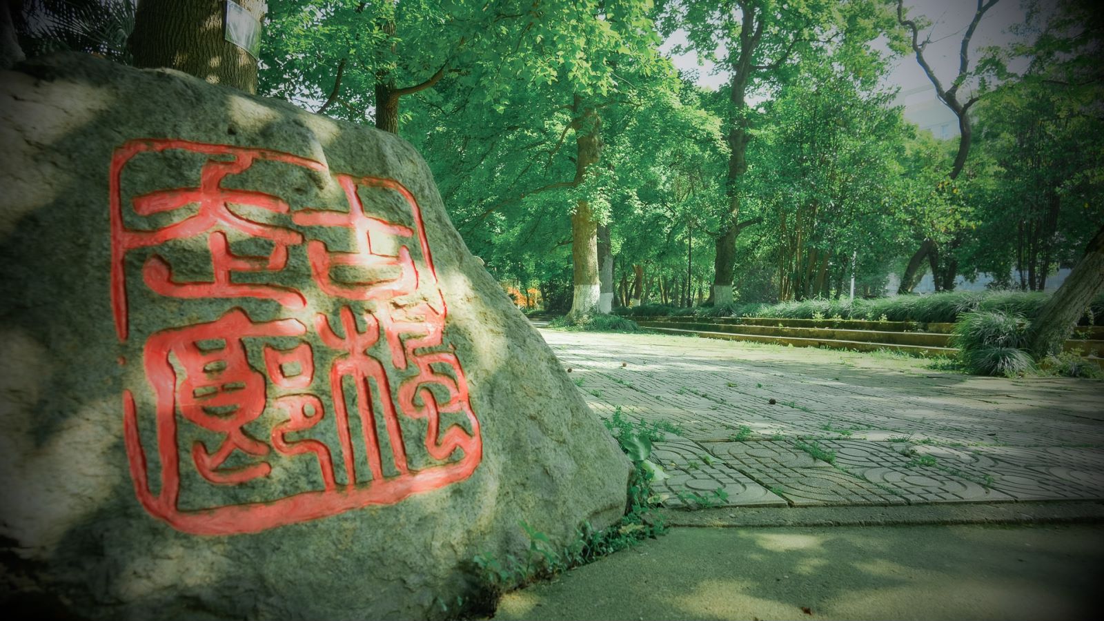 厚厚的枝條爭相蔓延在老校印記,陽光從樹枝間篩下,地上光影斑斕,這是初夏的訊息;漫步古楓走廊,郁郁蔥蔥的樹木靜靜佇立,陽光灑落,樹葉染上一層翠綠宛如新生,滿眼生機。